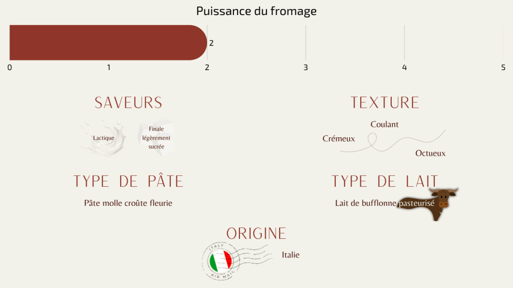 De la taille du Camembert de Normandie, de même poids également, son origine et son lait en font sa particularité. En effet, il est produit en Italie (nous verrons plus tard la petite anecdote à ce sujet). Il respecte le moulage à la louche. Son affinage dure 2 semaines au minimum. Le fait de faire un camembert mais avec du lait de bufflonne rend le fromage plus crémeux et onctueux qu’un camembert de Normandie. Son lait le rend également plus doux et ajoute une note légèrement sucrée en fin de bouche.
